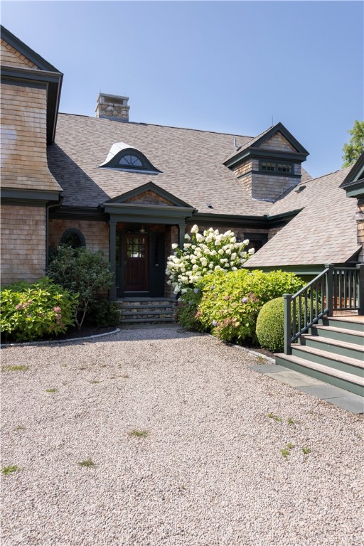 Just minutes from historic Watch Hill, this coastal retreat captures the rare harmony of mountain lodge warmth and seaside sophistication. Anchored by a soaring two-story stone fireplace, the great room with 30 foot ceilings flows seamlessly into a chef's kitchen and dining space, all wrapped in walls of glass that flood the interiors with natural light. Rich wood accents lend a timeless warmth, while subtle coastal details infuse a breezy elegance your own coastal cabin where forest and ocean meet. Perched high on over two acres of pristine grounds, the home spans over 6,000 square feet with panoramic vistas that sweep across the Atlantic, from Block Island to Montauk. Every bedroom offers an ensuite, while the primary suite is a spa-like haven of indulgence. A sunroom off the main living space beckons for painting, reading, or simply soaking in the views, while a game room off the kitchen ensures effortless entertaining. The finished lower level extends the living space with room for fitness, media, or guests, while the three-car garage offers both convenience and storage for coastal adventures. Outside, manicured landscaping frames expansive decks and gathering spaces, designed to celebrate every sunrise and sunset. A rare fusion of scale, setting, and style, this home is at once intimate and grand an inspired canvas for coastal living at its most refined. Come make this extraordinary home your own!